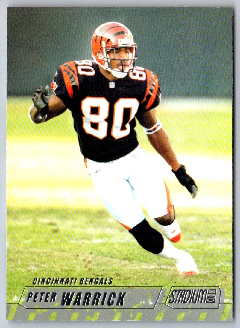 Be part of NFL history with the 2002 Stadium Club Peter Warrick #65 Cincinnati Bengals! This card features a stunning action photograph of Warrick in his Bengals uniform, perfect for any die-hard fan. With a glossy finish, it's perfect for framing and displaying in your home or office. The card is in near-mint condition, making it a great addition to any collection. Add this card to your collection and own a piece of history!