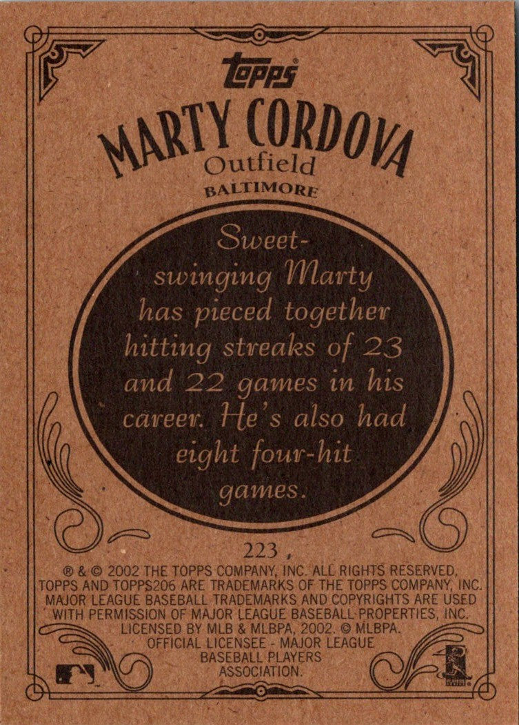 This 2002 Topps 206 Marty Cordova #223Baltimore Orioles card is a must-have for any Orioles fan! One of the most popular cards of the Topps 206 series, this card features a beautiful color image of Cordova in his iconic Orioles uniform. The back of the card contains his stats and biography, giving you a closer look at this legendary player. Whether you are a collector or just an Orioles fan, this card is sure to bring you a smile every time you look at it. Add it to your collection today!