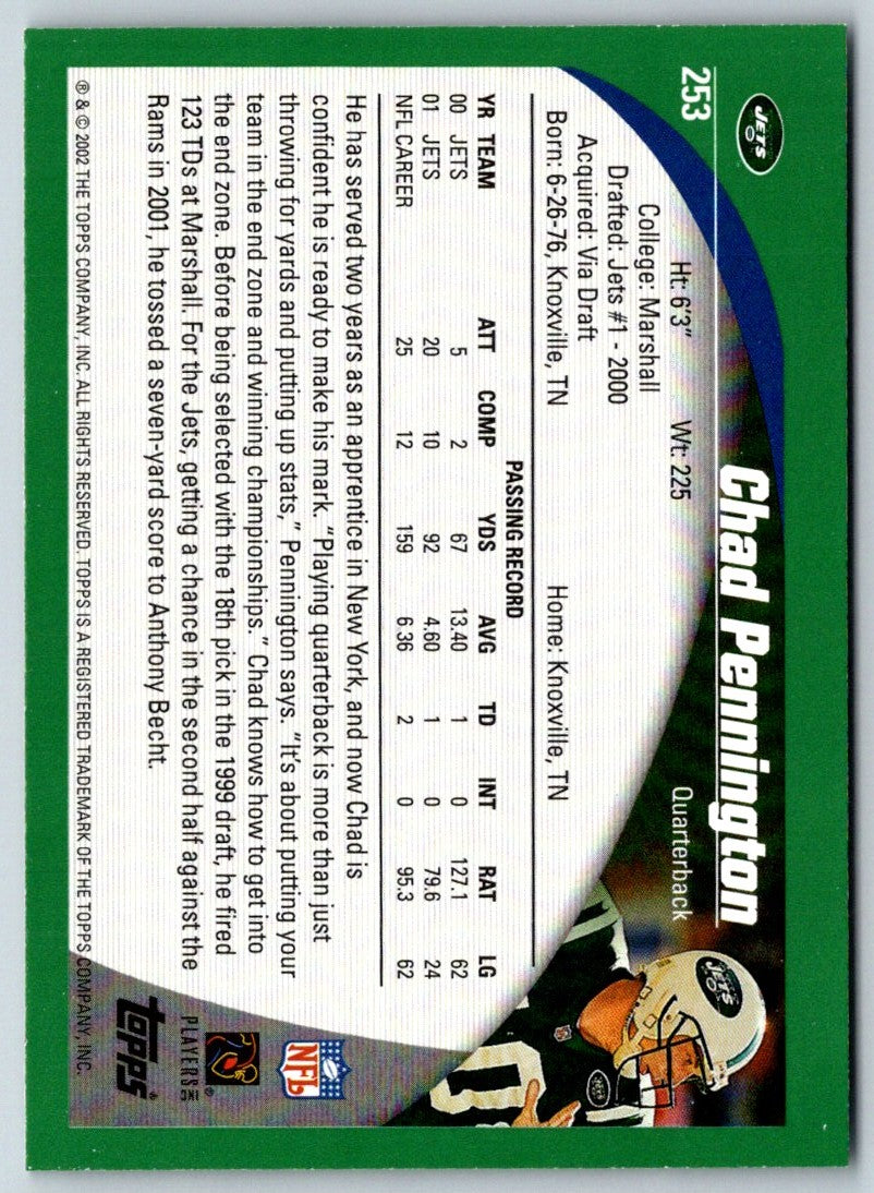 This 2002 Topps Chad Pennington #253 New York Jets card is the perfect addition to any collection. Featuring an iconic image of Pennington in his Jets uniform, this card is sure to be a hit with any fan of the team. With great detail and vibrant colors, this card is a must-have for any New York Jets fan. A great way to commemorate one of the team's most memorable players, this card is sure to be a cherished addition to your collection.
