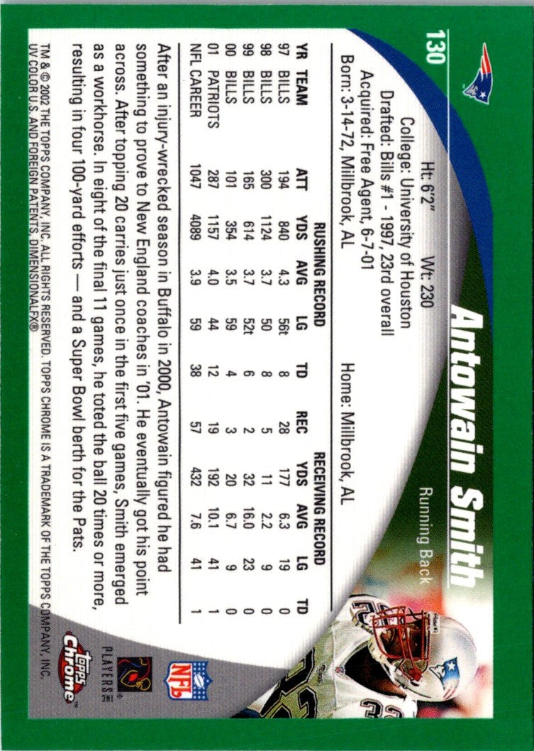This 2002 Topps Chrome Antowain Smith #130 card is a must-have for New England Patriots fans! With its sharp design and vivid colors, this card is sure to stand out in any collection. It features a full-color action shot of Antowain Smith, the running back who helped the Patriots to two Super Bowl victories. A great addition to any NFL fan's collection, this card is sure to bring back memories of the team's glory days. Add this card to your collection today and you won't be disappointed.