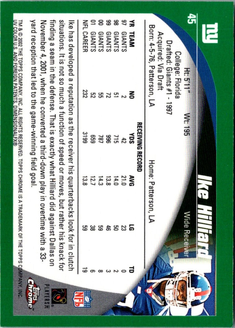 Relive the glory of 2002 with the Topps Chrome Ike Hilliard #45 card from the New York Giants. This card is a must-have for any Giants fan or collector, depicting Hilliard in his classic blue and red uniform. It is printed on high quality card stock and features full-color action photography. The card is in mint condition, perfect for any fan or collector to add to their collection. Get your hands on this classic card of the Giants legend today!