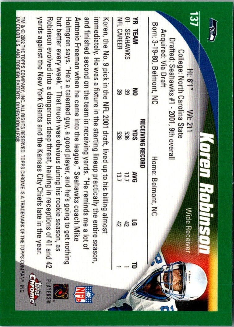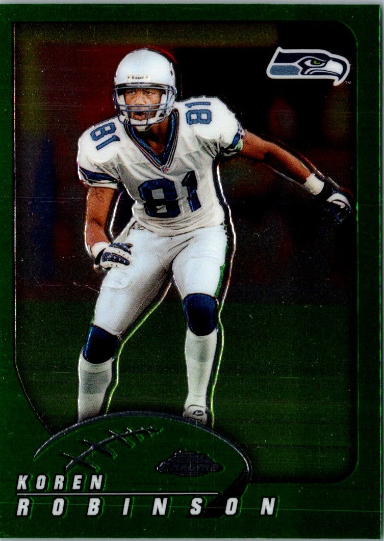 This 2002 Topps Chrome Koren Robinson #137 is a must-have for any Seattle Seahawks fan. This card features a bright, full-color image of the popular NFL player, and all the details of the card are printed in crisp, clear detail. With its glossy chrome finish, this card is perfect for any collection. Show your support for the Seattle Seahawks and add this card to your collection today!