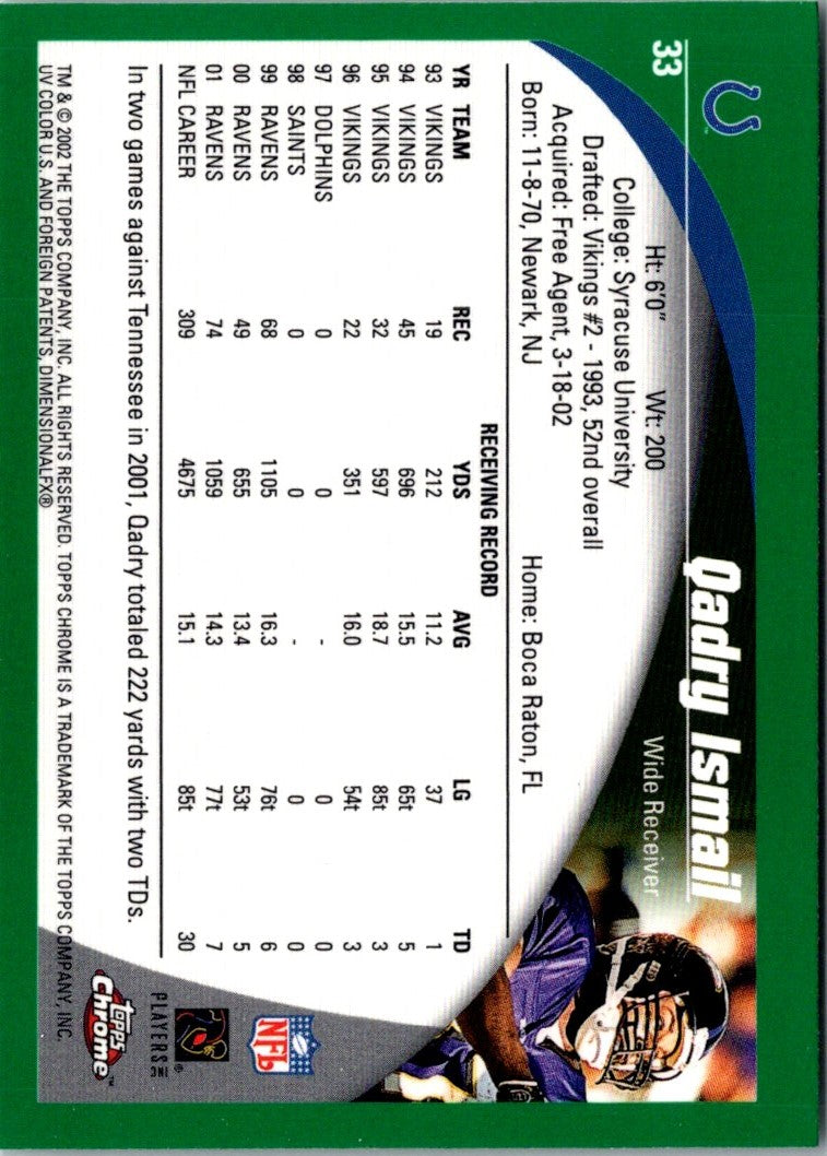 This 2002 Topps Chrome Qadry Ismail #33 Indianapolis Colts card will be a great addition to your collection! Featuring a full-color action photo of Ismail in his blue and white Colts uniform, this card captures the excitement of the game. The reverse side displays Ismail's career stats and a brief bio. This card is the perfect way to show your support for the Colts and Ismail's career!