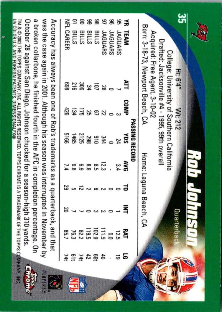 This 2002 Topps Chrome Rob Johnson #35Tampa Bay Buccaneers card is a must-have for any Bucs fan or football card collector. Featuring a glossy chrome finish, this card is sure to stand out from the rest in your collection. Johnson appears in full Buccaneers gear, giving this card an authentic look. This card is a great way to commemorate Johnson's time with the Bucs and show your team pride. Add this card to your collection and you won't be disappointed!