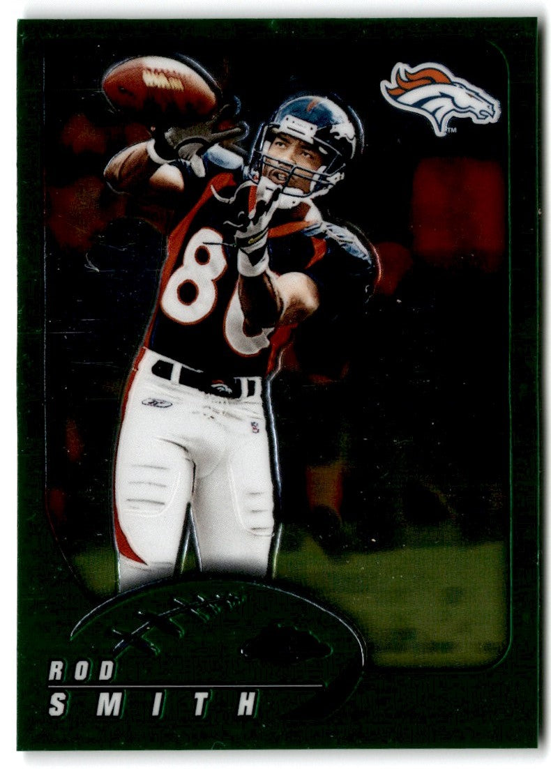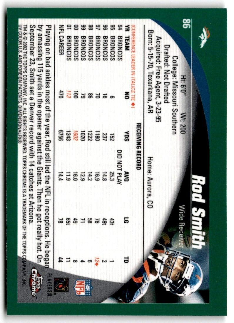 This 2002 Topps Chrome Rod Smith #86 from the Denver Broncos is a must-have for any football fan! It features a glossy chrome finish with a vivid image of Rod Smith in action on the field. This card captures the essence of Smith's legendary football career as a running back and kick returner. This card is a great addition to any sports memorabilia collection. Add it to yours today!