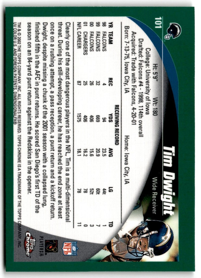 This 2002 Topps Chrome Tim Dwight #101 San Diego Chargers card is a must-have for any Chargers fan! This card is a perfect addition to any collection, featuring a glossy chrome finish with a high-quality image of Dwight. This card also has an attractive design with the team's colors and logo on the front. The back of the card features a detailed biography and career stats of Tim Dwight. Don't miss out on this 2002 Topps Chrome Tim Dwight #101 San Diego Chargers card and add it to your collection today!