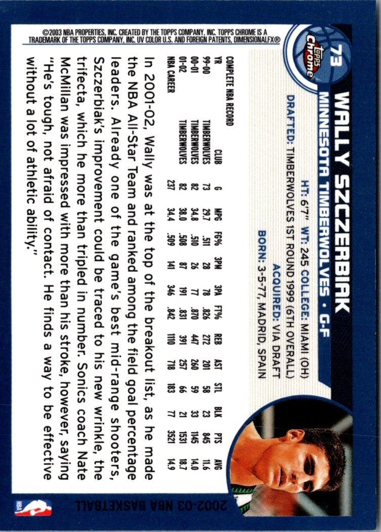 2002 Topps Chrome Wally Szczerbiak #73 is an eye-catching card, with an action shot of the Minnesota Timberwolves guard. The card features a bright chrome border, with a sharp picture of Szczerbiak in his Timberwolves uniform. The card is a must-have for any fan of the Timberwolves or Szczerbiak himself. The card is a great item to add to your collection or to give to a fellow fan!