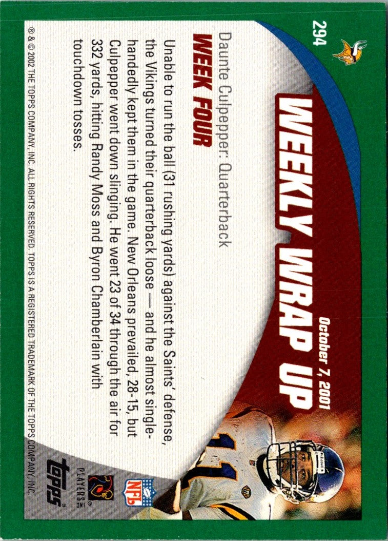 This 2002 Topps Collection Daunte Culpepper #294 Minnesota Vikings card is a must-have for any serious football fan or card collector! Show your appreciation for the one-time Pro Bowler and NFL All-Pro with this classic piece of memorabilia. This card features a full-color action shot of Culpepper in his Minnesota Vikings jersey, and is sure to become a treasured part of your collection. Add this card to your collection today and show your admiration for one of the all-time greats!