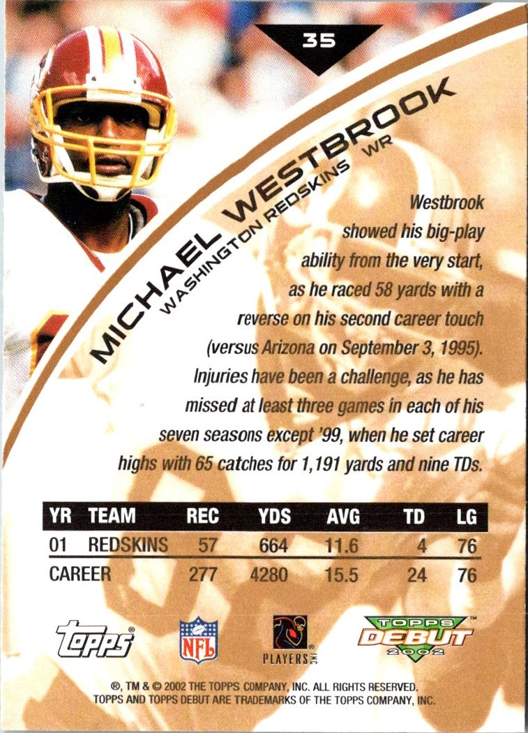This 2002 Topps Debut Michael Westbrook card is a must-have for any serious Washington Redskins fan. The card features a color action photo of Westbrook in his iconic #35 jersey. On the back of the card is Westbrook's bio and a detailed list of his accomplishments. This card is a great way to honor the legacy of this legendary Washington Redskins wide receiver. Add it to your collection today!