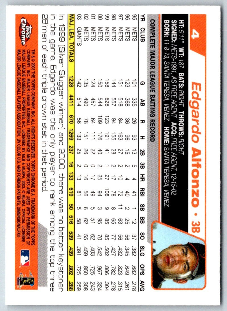 This 2002 Topps Edgardo Alfonzo #258 New York Mets card is a great addition to any Mets fan's collection. Featuring the beloved infielder in his classic batting stance, this card is the perfect reminder of Alfonzo's past accomplishments with the Mets. Show your support for the Mets with this classic card, and get your collection started today!