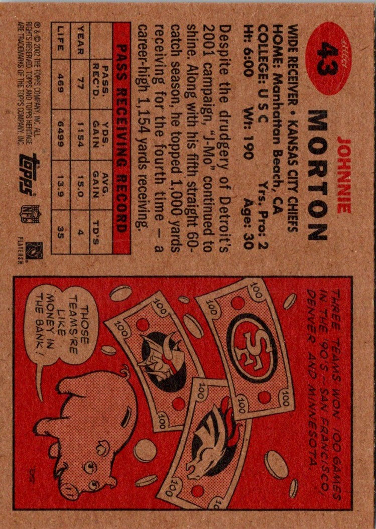 This 2002 Topps Heritage Johnnie Morton #43 Kansas City Chiefs card is a must-have for any collector. The card features Morton in his classic Chiefs uniform, and the beautiful colors and artwork make this card stand out. It's perfect for any Chiefs fan, and would make a great addition to any collection. Show your support for Morton and the Chiefs with this timeless card!