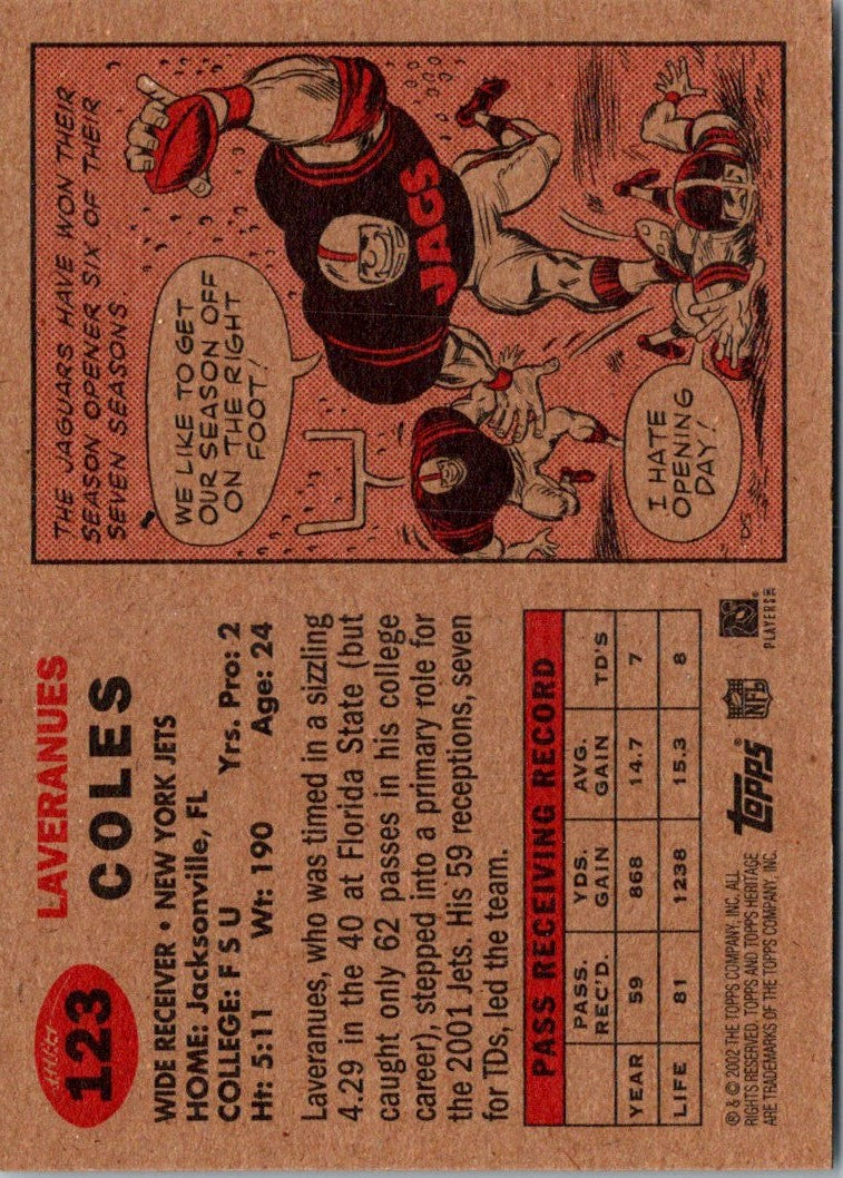 This 2002 Topps Heritage Laveranues Coles #123 card celebrates the New York Jets wide receiver. Coles was a three-time Pro Bowl selection and racked up over 8,000 career receiving yards. This card is in mint condition and features an action shot of Coles with the Jets uniform. It's a great way to celebrate and honor one of the most talented wide receivers of his generation. Add it to your collection today!