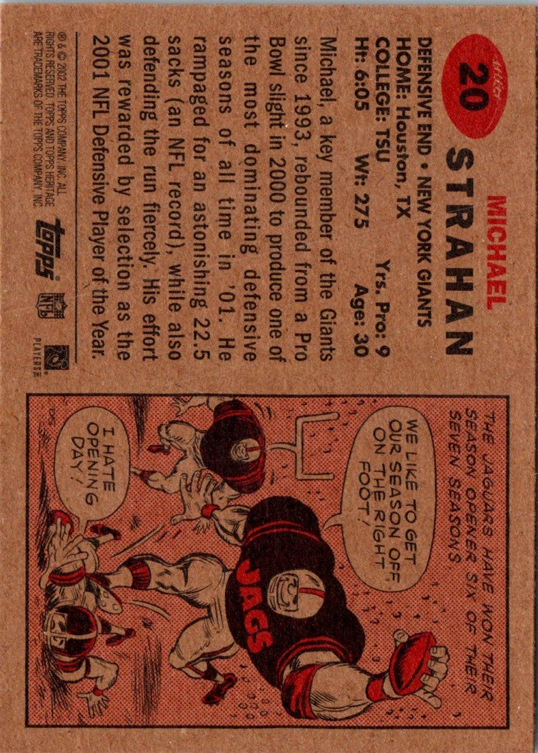 This 2002 Topps Heritage Michael Strahan #20 card is a must-have for any New York Giants fan! This card features a classic and iconic image of Strahan in his Giants uniform, making it a great addition to any memorabilia collection. The card is printed on high-quality cardstock and features vibrant colors that bring Strahan to life. It's sure to be a conversation starter, and a great way to show your support for the Giants!