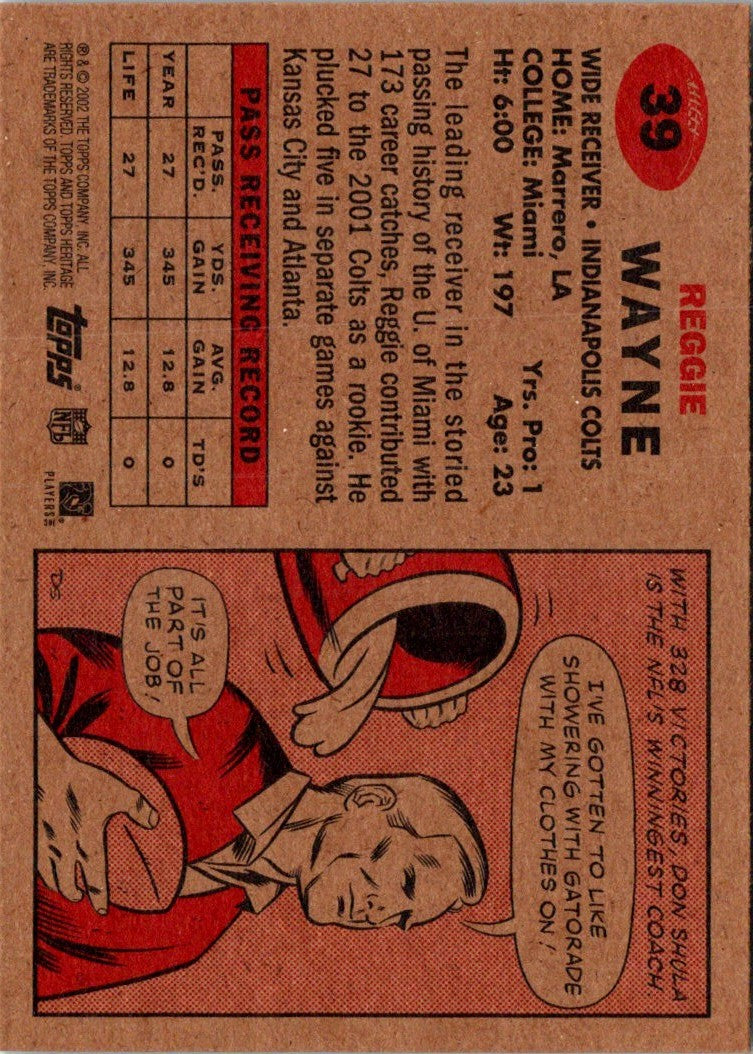 This 2002 Topps Heritage Reggie Wayne #39 Indianapolis Colts card is a great addition to any Colts fan's collection. This card features a great action shot of Wayne in his Colts uniform and is a great reminder of the amazing season he had in 2002. The card is in great condition and will look great in any collection. Add this must-have card to your collection today!
