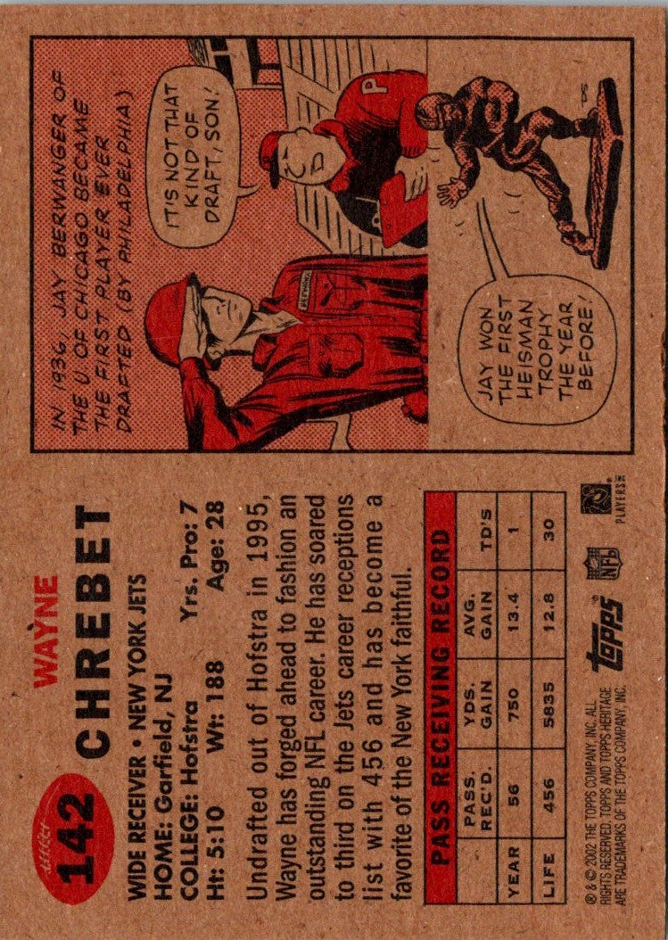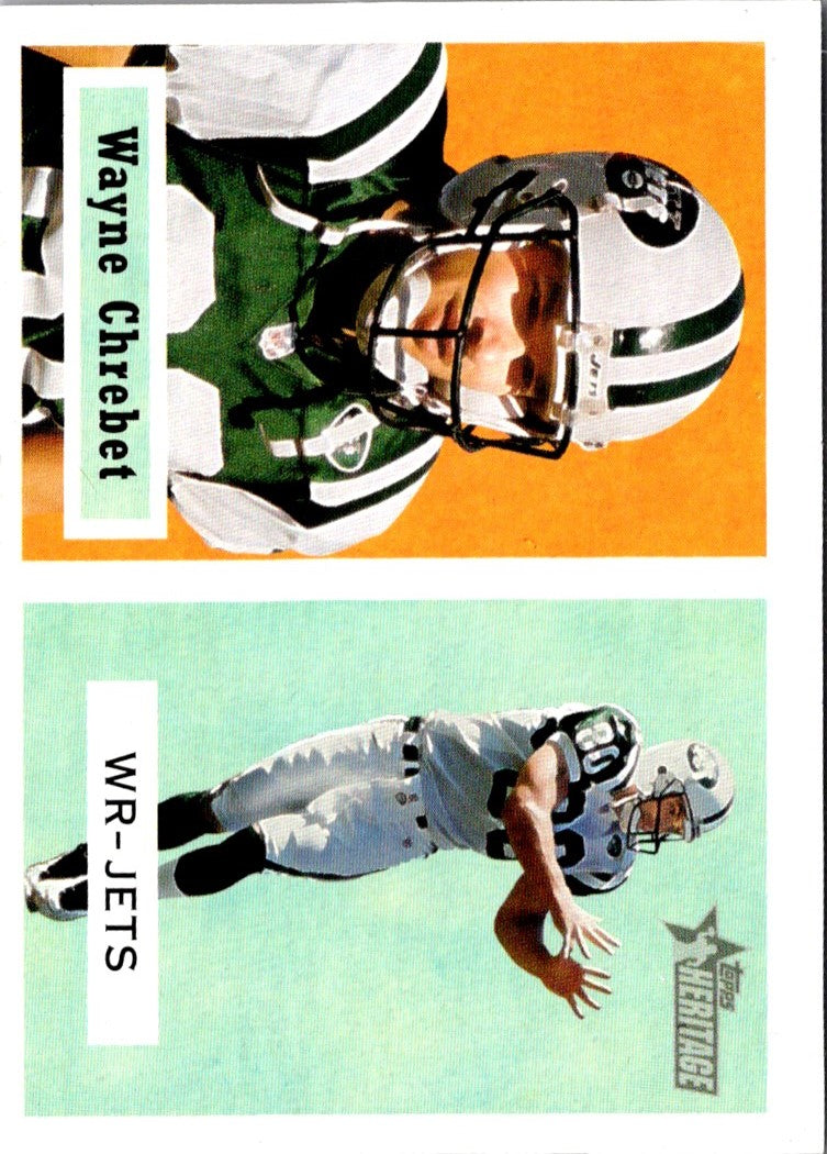 Relive the glory days of the New York Jets with this 2002 Topps Heritage Wayne Chrebet card! This card features a portrait of Chrebet in the classic Jets uniform and captures the essence of the wide receiver's storied career. The back of the card contains a detailed biography of Chrebet's career accomplishments as well as his stats from the 2002 season. This card is a must-have for any Jets fan, and would make a great addition to any sports card collection.