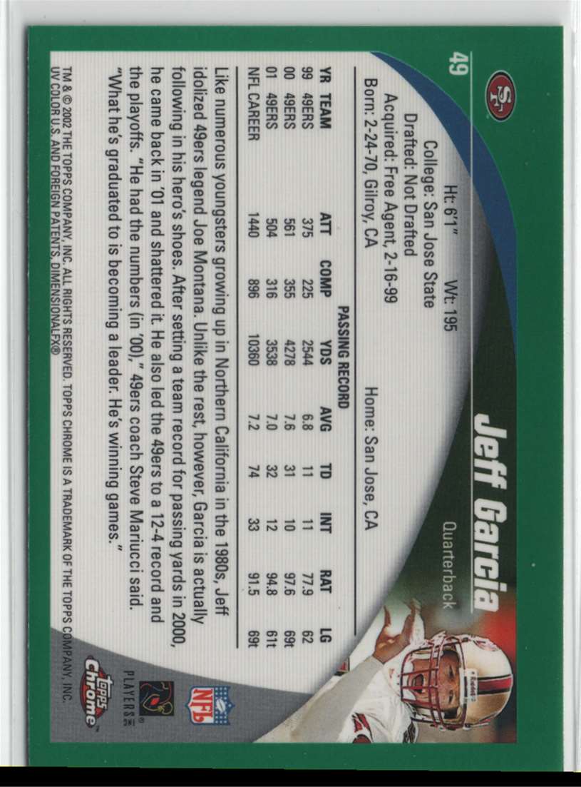This 2002 Topps Jeff Garcia #51 card is the perfect addition to any San Francisco 49ers collection. Featuring the veteran quarterback in his signature pose, this card is sure to bring back fond memories of Garcia's days on the gridiron. The card is printed on high-quality cardboard, making it a durable item that will last through the years. Any serious 49ers fan will love adding this card to their collection. Get your hands on this card and commemorate the career of one of the greatest quarterbacks in franchise history.