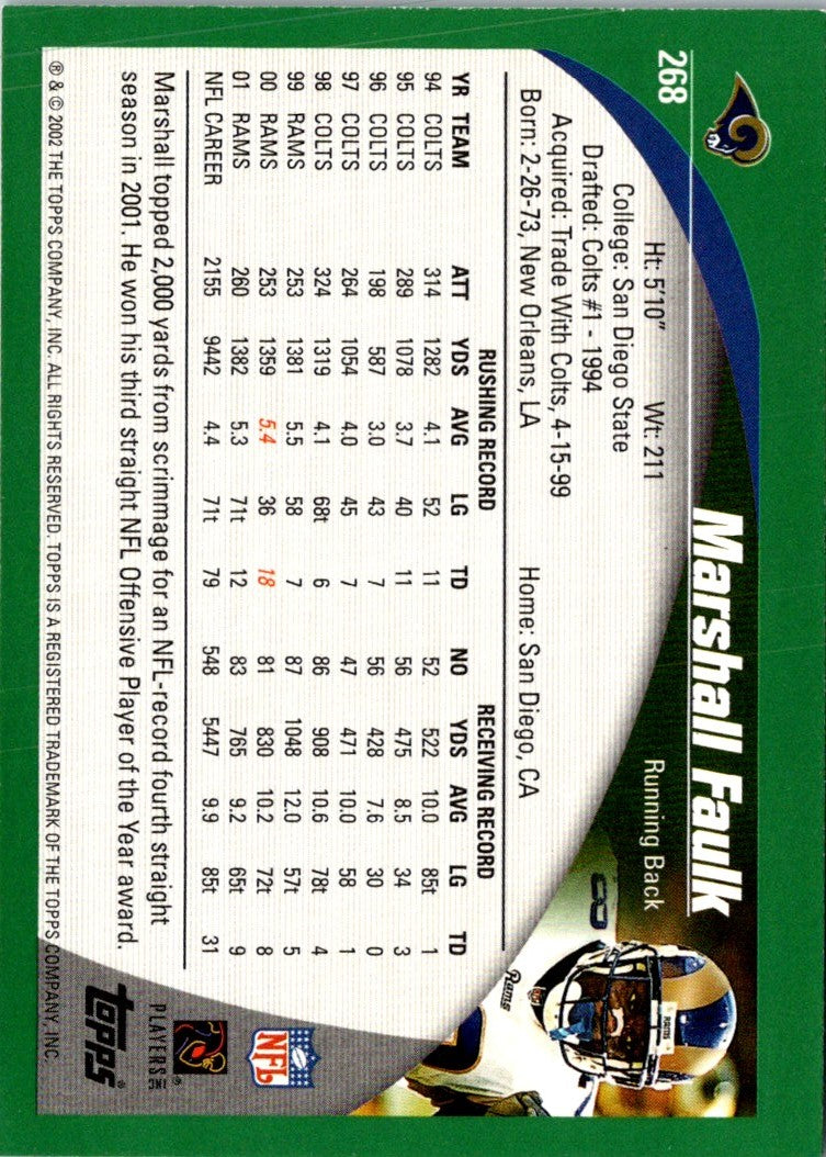 This 2002 Topps Marshall Faulk #268 St. Louis Rams card is a must-have for any Marshall Faulk collector. Featuring the legendary running back in his Rams uniform, this card is an excellent addition to any collection. With its colorful design, beautiful photography, and detailed stats, this card is sure to make a statement in any collection. Whether you're a die-hard collector or just a casual fan, this card is a great way to show your appreciation for one of the greatest players in the NFL. Add this card to your collection today and celebrate the career of Marshall Faulk!