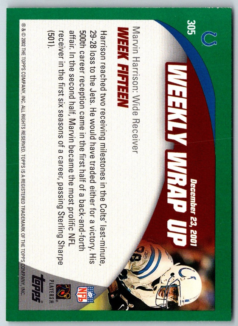 This 2002 Topps Marvin Harrison #305 Indianapolis Colts card is an essential addition to the collections of any true NFL fan. Featuring a classic throwback design and showcasing Harrison in his iconic blue and white uniform, this card celebrates one of the greatest wide receivers in NFL history. The card also features Harrison’s stats and accomplishments from the 2001 season, making it a great way to commemorate one of the most iconic players in Colts history. This card is sure to be a prized possession in any sports card collection.