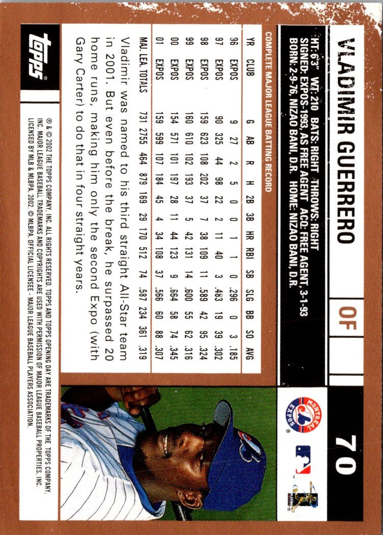 This 2002 Topps Opening Day Vladimir Guerrero #70 Montreal Expos card is a must-have for any baseball fan! This card features Guerrero in his classic batting stance, wearing his Expos jersey. It is the perfect way to commemorate a true baseball great and one of the game's all-time greats. This card is sure to be a valuable addition to any collection.