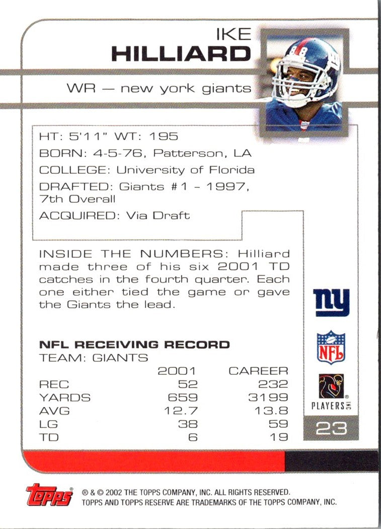 This 2002 Topps Reserve Ike Hilliard #23 New York Giants card is a must-have for any serious football fan. Featuring a stunning full color image of Hilliard in action on the field, this card is a great way to commemorate the legendary wide receiver. Perfect for any Giants collector, this card is sure to be a treasured addition to any collection. Get your hands on this piece of NFL history today!