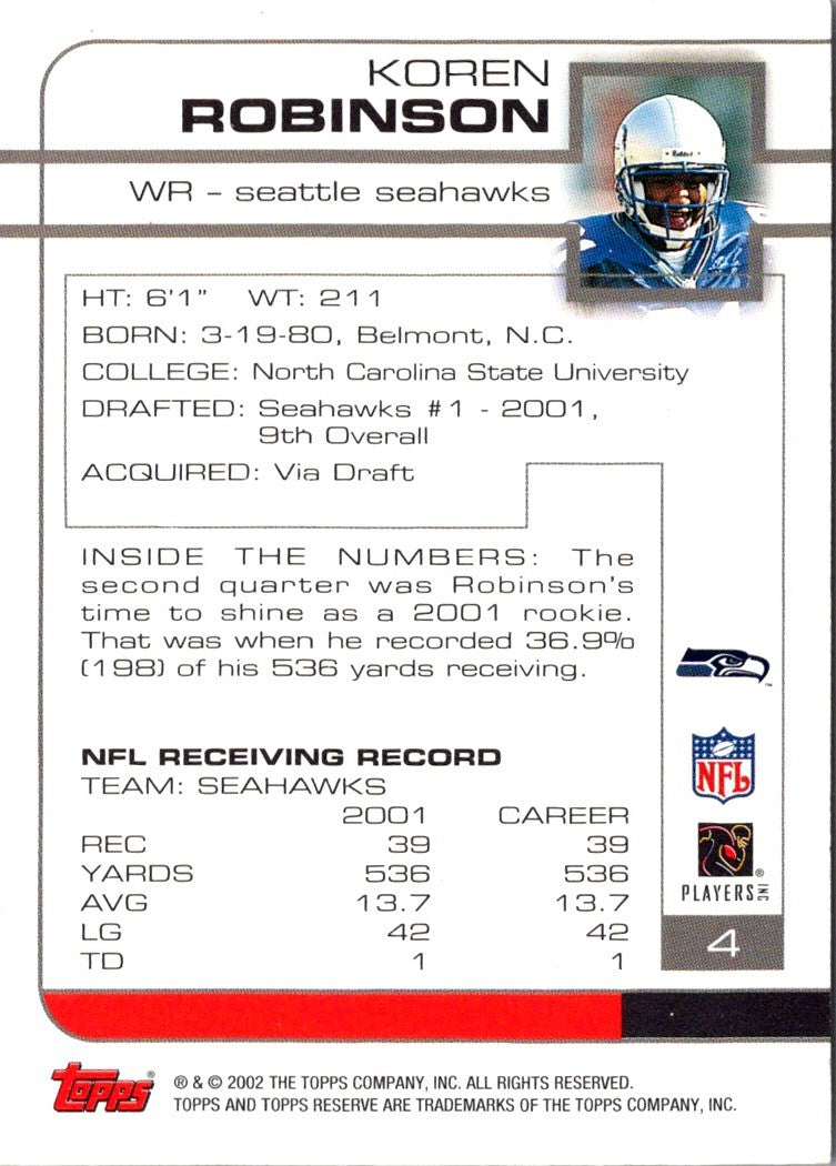 This 2002 Topps Reserve Koren Robinson #4 Seattle Seahawks card is a great collector's item for any fan of the team. It features a glossy, full-color image of Robinson in his signature uniform, with the Seahawks logo and team colors in the background. The card is printed on high-quality cardstock, and is sure to be a great addition to any collection. Whether you're a fan of the Seahawks or just a fan of Robinson, this card is sure to impress. Add it to your collection today!