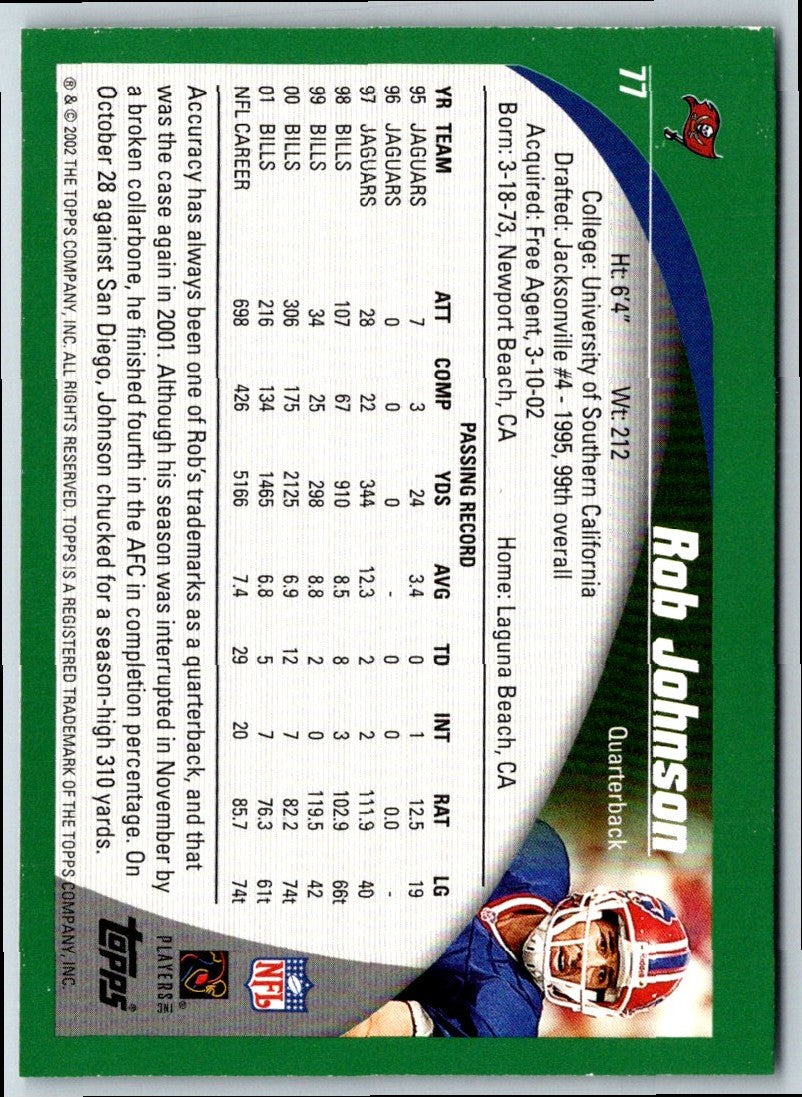 This 2002 Topps Rob Johnson #77 Tampa Bay Buccaneers card is a great addition to any Buccaneers fan's collection. It features a crisp, bold image of Rob Johnson in his Buccaneers uniform and a detailed statistical breakdown of his performance during the 2002 season. The card is in mint condition, and the back has a detailed write-up about Johnson's career with the Buccaneers. This card is a great way to show your support for the Buccaneers and commemorate one of the most talented quarterbacks in their history. Add it to your collection today!