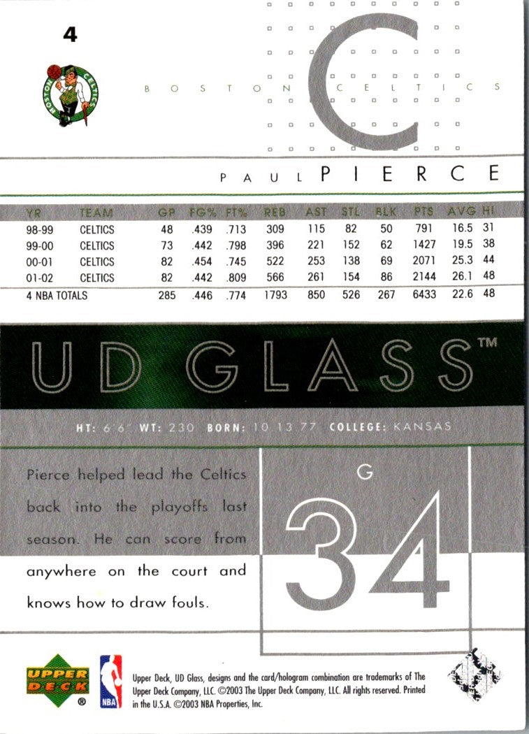 This 2002 UD Glass Paul Pierce card #4 is a must-have for any Boston Celtics fan! Featuring Pierce in his iconic green and white uniform, this card is sure to bring back fond memories of one of the greatest players in Celtics history. The card features a glossy finish and vibrant colors that bring the image of Pierce to life. Add this card to your collection and relive the glory days of the Celtics!