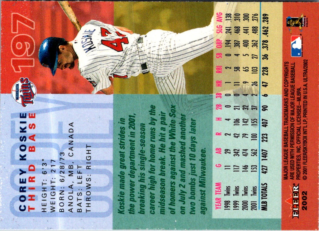 This 2002 Ultra Corey Koskie card is a must-have for any Minnesota Twins fan! Featuring a full-color photo of the infielder, this card captures the excitement of the 2002 season and is sure to become an instant collectible. The card also includes a detailed biography of Koskie's career, making it a great way to honor one of the Twins' all-time greats. Add this card to your collection and you'll have a piece of baseball history that will last a lifetime!