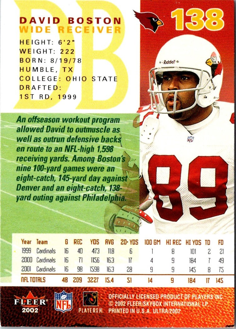 This 2002 Ultra David Boston #138 Arizona Cardinals card is a must-have for any football fan's collection. With its bold colors and sleek design, this card is sure to be a standout in any collection. Featuring a crisp image of Boston in his Arizona Cardinals uniform, this card is sure to bring back memories of the great football player. Celebrate Boston's career with this classic card and add it to your collection today.