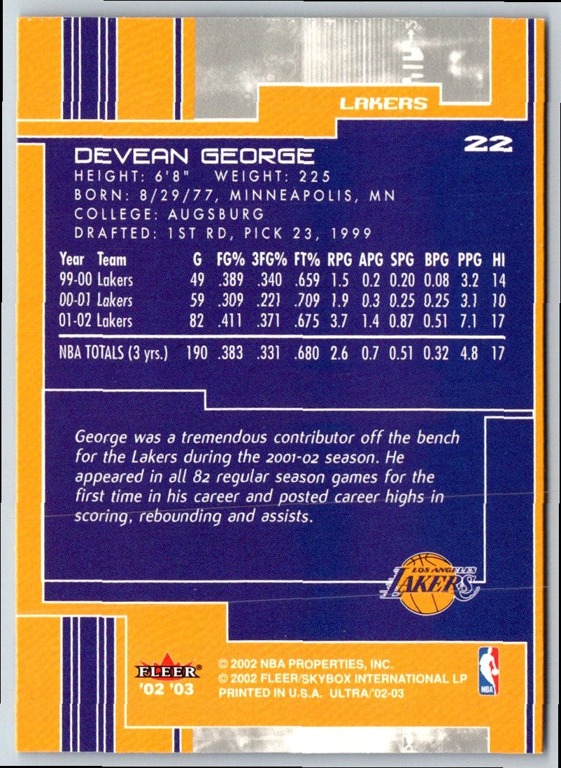 This 2002 Ultra Devean George #22 Los Angeles Lakers card is the perfect addition to any Lakers fan's collection. Featuring a bright and vibrant image of George in his Lakers uniform, this card captures the excitement of the team during this era. The back of the card features George's stats from the 2002 season, a brief biography, and other interesting facts about the player. With a glossy finish, this card will look great in any collection. Add this unique card to your Lakers memorabilia today!