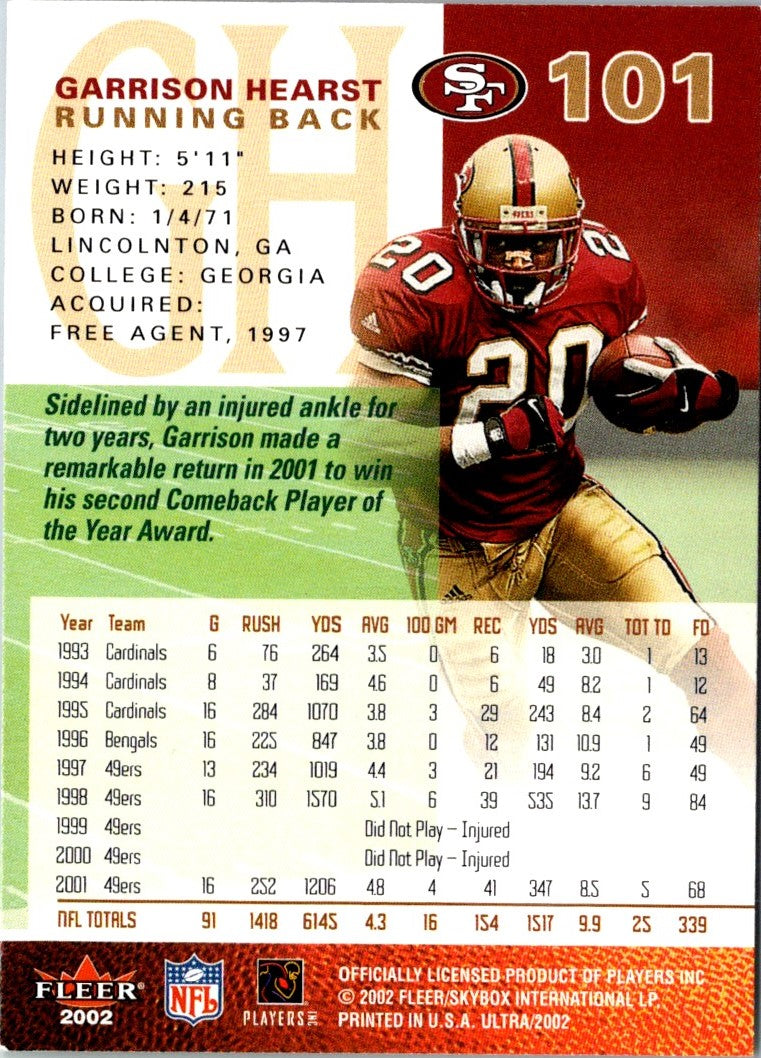 This 2002 Ultra Garrison Hearst #101 San Francisco 49ers card is a must-have for any Niners fan. Featuring a stunning and detailed image of Hearst, this card is in excellent condition and will make a great addition to any collection. It is the perfect way to show your support for the 49ers and honor one of their greatest players, Garrison Hearst. Get your hands on this amazing card today and make sure to show it off to your friends and family!