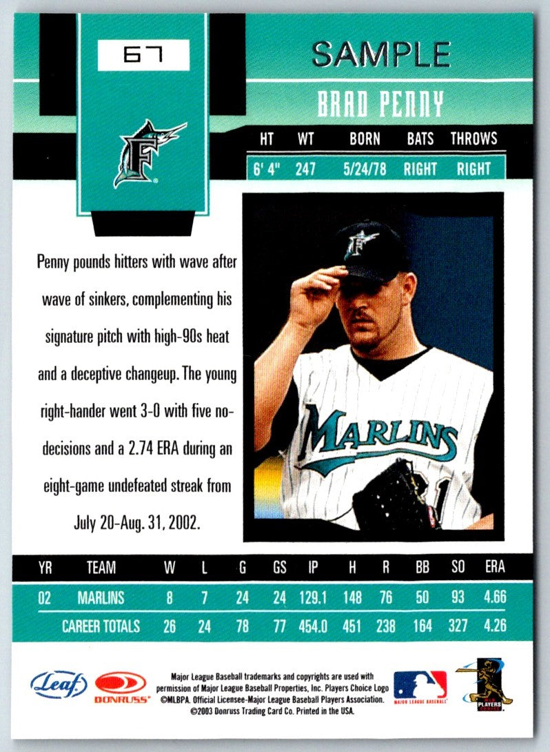 Introducing an exciting piece of memorabilia from the 2003 Leaf Certified Materials Baseball card set. This card of Florida Marlins pitcher Brad Penny is a must-have for any Marlins fan. Featuring a glossy finish and a full-color action shot of Penny in his Marlins jersey, this card is perfect for the collector who wants to show support for their favorite team. This card also features a brief biography on the back and is sure to become a treasured piece of memorabilia for many years to come. Get your 2003 Leaf Certified Materials Brad Penny card today and add it to your collection!
