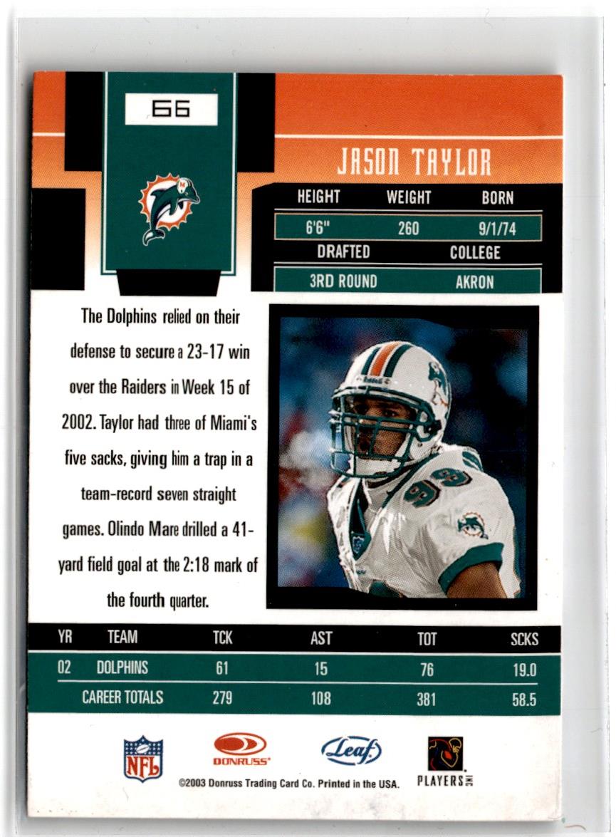 Introducing the 2003 Leaf Certified Materials Jason Taylor #66 Miami Dolphins trading card! This collectible card features a glossy image of the legendary defensive end in his game-day jersey. The card is printed on a high-quality, durable stock and is perfect for any Miami Dolphins or NFL fan. Add this card to your collection today and show your support for one of the greatest defensive players in NFL history!
