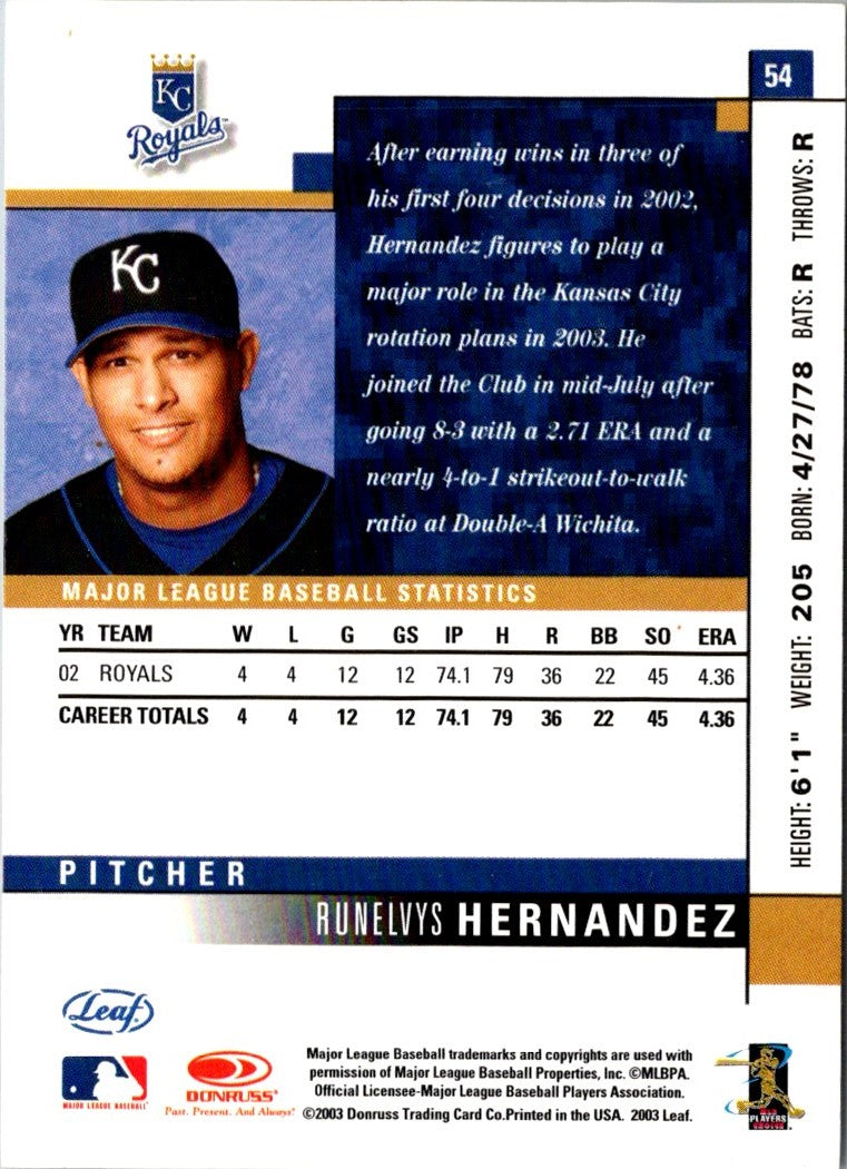 This 2003 Leaf Runelvys Hernandez #54 Kansas City Royals baseball card is a must-have for any Royals fan! It features an action shot of Hernandez on the mound, with a bright blue background to really make the photo pop. The card is in excellent condition, with crisp corners and no signs of wear. Hernandez was a key part of the Royals' pitching staff during his stint with the team. He was known for his intimidating fastball and sharp slider, and was a fan favorite. This card is the perfect way to commemorate Hernandez's time in Kansas City and makes a great addition to any baseball card collection.