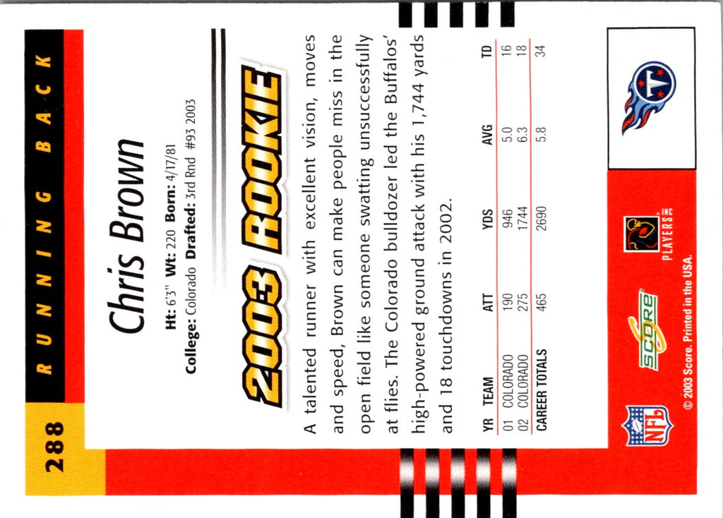 Description: 2003 Score Chris Brown #288 Rookie