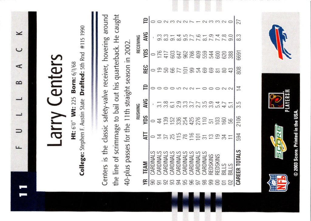 This 2003 Score Larry Centers card #11 of the Buffalo Bills is a must-have item for any fan of the Bills. This card features a detailed image of Centers in a Bills uniform, complete with his signature on the front. The card also features a great action shot of Centers, making a great play on the field. This card is perfect for any Bills fan looking to add a unique piece to their collection. Get your hands on this card today and be a part of Bills history!