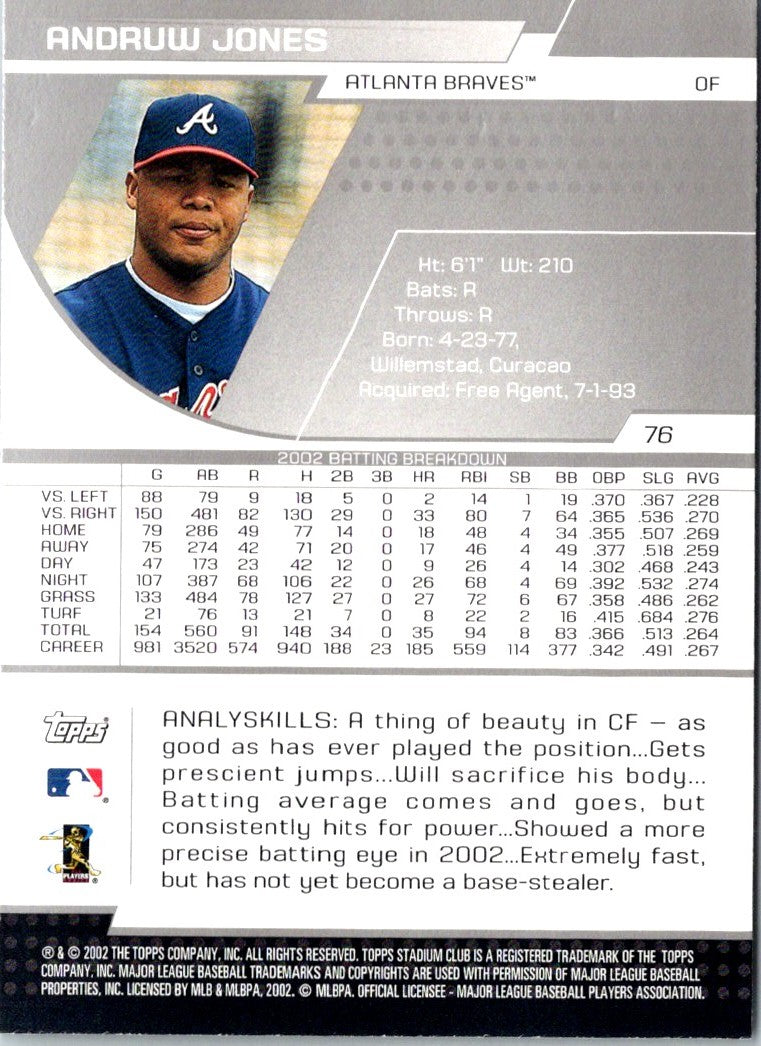 Introducing the 2003 Stadium Club Andruw Jones #76 Atlanta Braves card! This card features a stunning image of the All-Star outfielder in his Braves uniform, with a deep blue background behind him. The card also features a unique foil stamp and a glossy finish. Collectors will also appreciate that this card is from one of the most popular baseball card sets of the 2000s. Get your hands on this card and add it to your collection today!