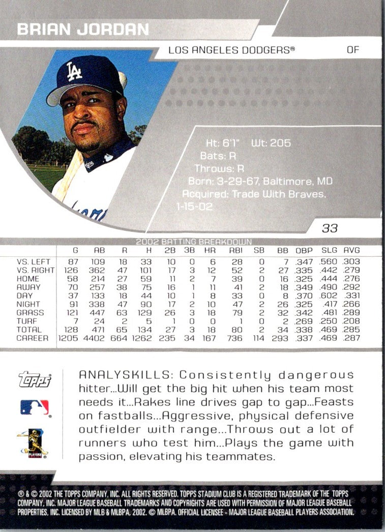 The 2003 Stadium Club Brian Jordan #33 Los Angeles Dodgers card is a must-have for any fan of the Dodgers, or of Brian Jordan himself. Featuring amazing artwork of Brian Jordan in his Dodgers uniform, this card is sure to be a great addition to any collection. The card is printed on the highest quality card stock, making it a durable piece of memorabilia. The vivid colors and sharp details of the card make it a standout piece. With this card, you can celebrate the career of one of the greatest players to ever wear the Dodgers uniform. Add this card to your collection today!