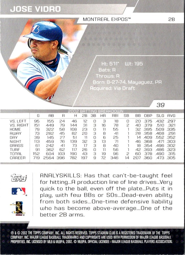 This 2003 Stadium Club Jose Vidro #39 Montreal Expos card is an absolute must-have for any true fan! The card features a full-color photo of the All-Star second baseman in action, capturing his natural grace and athletic prowess in the field. The back of the card has his full stats and an overview of his career, making it great for any collector! This card is sure to become a treasured part of any collection and is a great way to commemorate the career of one of the greatest players to ever wear an Expos uniform. Don't miss your chance to add this iconic card to your collection today!