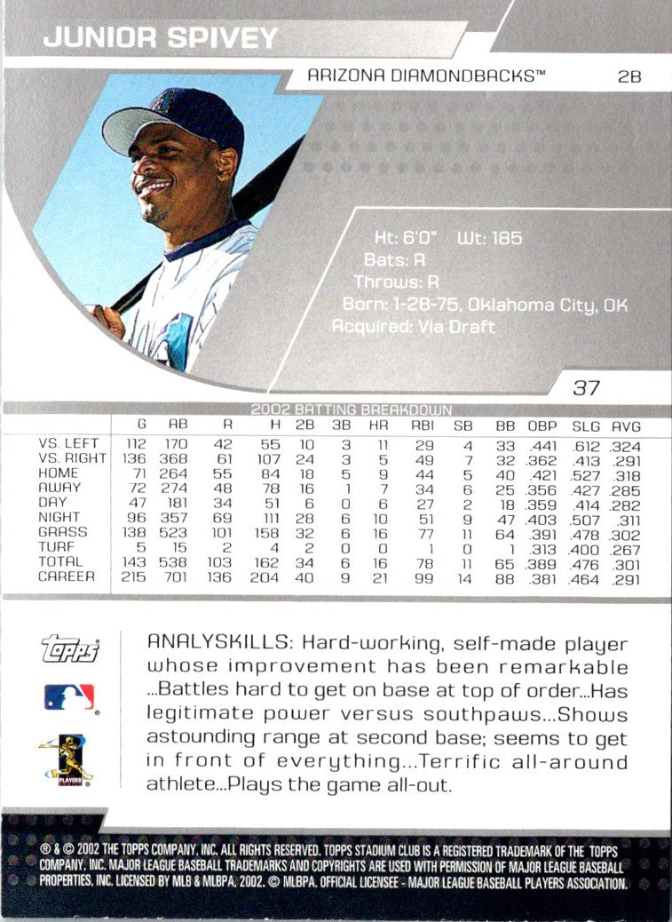 This 2003 Stadium Club Junior Spivey card from the Arizona Diamondbacks features the outfielder in his iconic batting stance and is a must-have for any baseball card collector. The vibrant colors and sharp details make this card stand out in any collection. The Stadium Club logo is displayed to the left of the player, and the card is numbered #37. This card is a great way to commemorate the career of Junior Spivey and to add an iconic piece of Diamondbacks history to your collection.