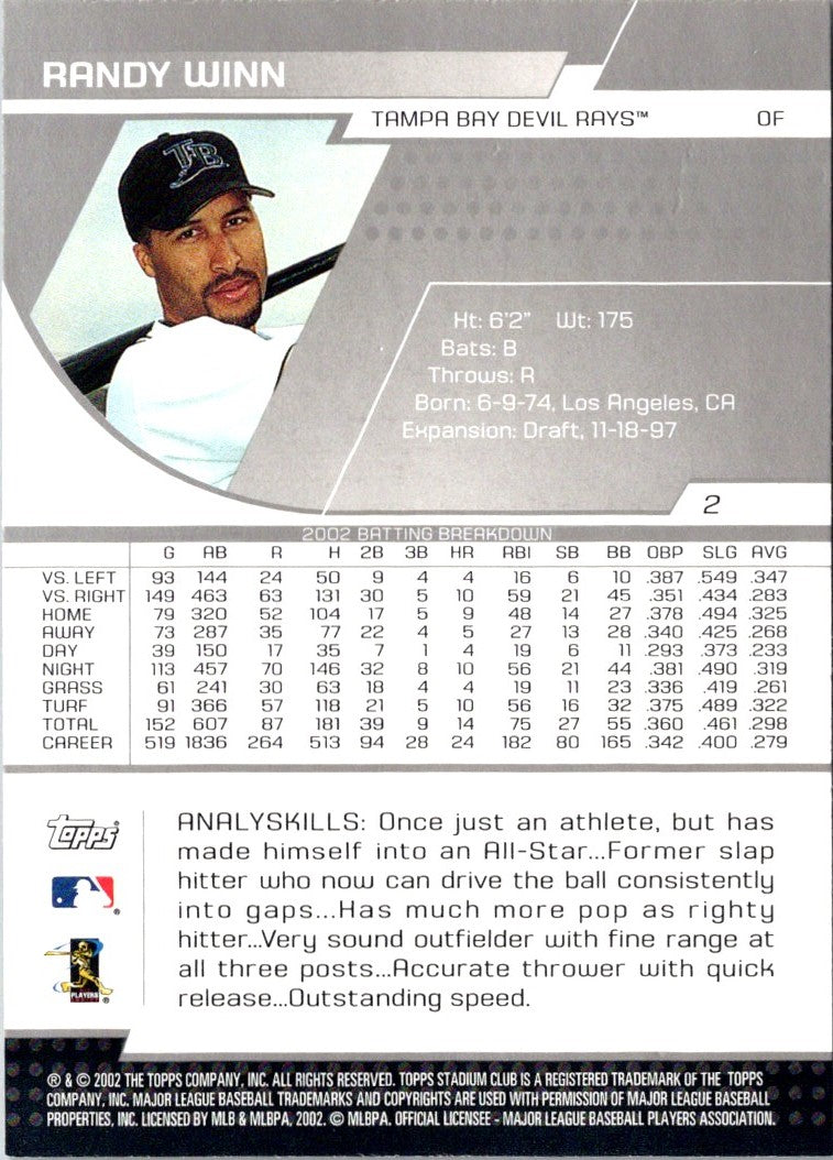 This 2003 Stadium Club Randy Winn #2 Tampa Bay Devil Rays card is a must-have for any fan of the Devil Rays or Randy Winn. Featuring a stunning image of Winn in action in his signature Rays uniform, this card is sure to be a hit with any collector. With sharp corners and clean edges, this card is sure to be a prized possession in any collection. This card is sure to be a timeless collectible that will only increase in value over time. Get your hands on this card today and add a unique piece of Rays history to your collection!