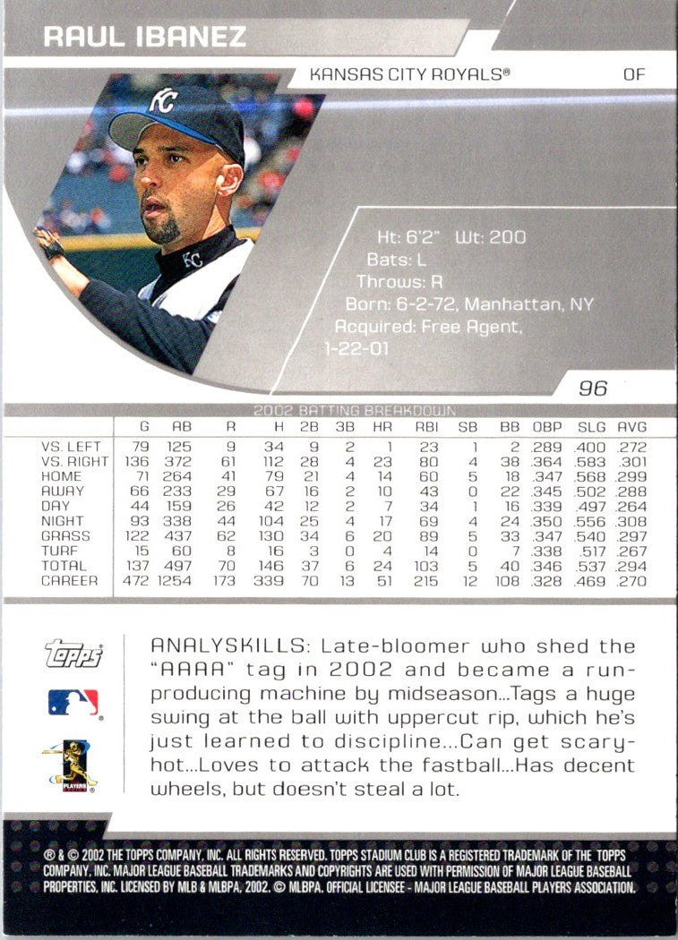 This 2003 Stadium Club Raul Ibanez #96Kansas City Royals card is a great addition to any trading card collection. Ibanez was an All-Star outfielder for the Royals and this card captures him in action during his time with the team. The card is in mint condition and the vibrant colors show off the details of the image beautifully. It is a must-have for any Royals fan or collector of Ibanez memorabilia. Add this iconic card to your collection today!