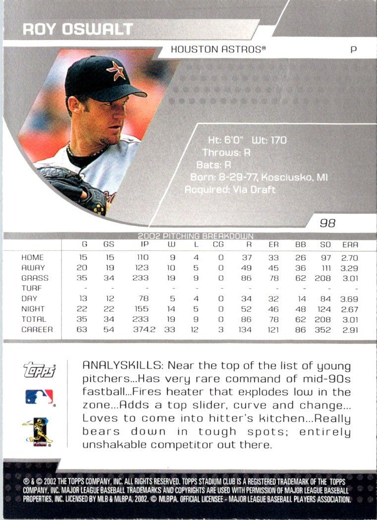 This 2003 Stadium Club Roy Oswalt #98 Houston Astros card is an essential addition to any Astros fan's collection. It features the pitcher in a signature Astros jersey and cap, ready to deliver a fastball to the plate. The card's reverse side displays Oswalt's career stats and highlights, giving you a glimpse of his impressive seven-year tenure with the team. It's a great way to celebrate one of the franchise's most beloved players. The card is in near-mint condition and an excellent choice for collectors. Add it to your collection today and show your support for one of Houston's all-time greats!