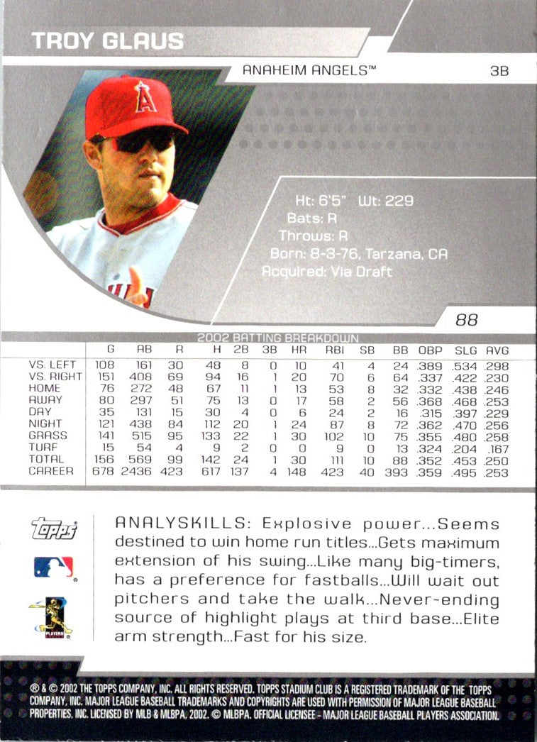 This 2003 Stadium Club Troy Glaus card is the perfect addition to any Anaheim Angels fan's collection. This card features a portrait of the legendary third baseman in his #88 Anaheim Angels uniform, reminding us of his many successes on the field. Glaus was a two-time All-Star, four-time Gold Glove, and a two-time Silver Slugger Award winner. The card also features a beautiful background with the Angels logo, making it an eye-catching display piece. Add this card to your collection today and commemorate the career of one of the greatest to ever wear the Anaheim Angels uniform.