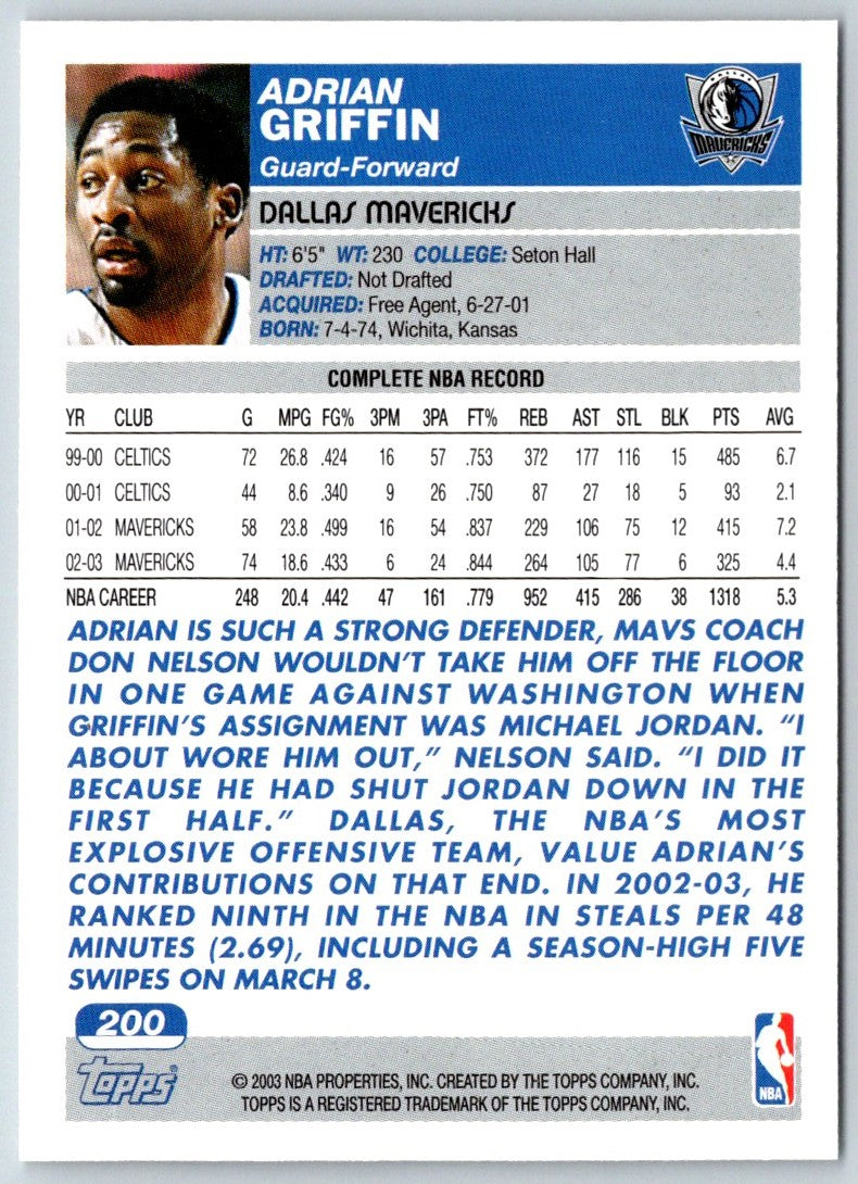 This 2003 Topps 1st Edition Adrian Griffin #200 Dallas Mavericks card is a must-have for any basketball collector. Featuring a full-color image of Griffin in his Mavericks uniform, this card captures a moment in time that will be remembered by fans for years to come. The card also features detailed stats and biography of Griffin's playing career. Whether you're just starting your collection or looking to add to your current collection, this card is sure to be a winner. Add this piece of basketball memorabilia to your collection today!