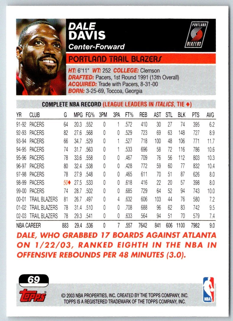 This 2003 Topps 1st Edition Dale Davis card (#69) is a must-have for any Portland Trail Blazers fan. Show your support for your favorite team and player with this collectible card. Featuring a vibrant illustration of the power forward in his classic blue and black Blazers uniform, the card is the perfect addition to any fan's collection. Get your hands on this card and show your support for the Trail Blazers and Dale Davis.