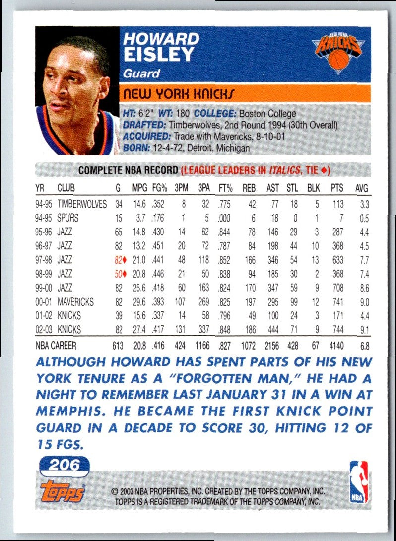 This 2003 Topps 1st Edition Howard Eisley card is a must-have for any New York Knicks fan! Featuring a full-color action shot of Eisley on the court, this card is sure to make a great addition to any collection. With the 1st Edition logo on the front, this card is a piece of basketball history. Get your hands on this classic card before it's gone!