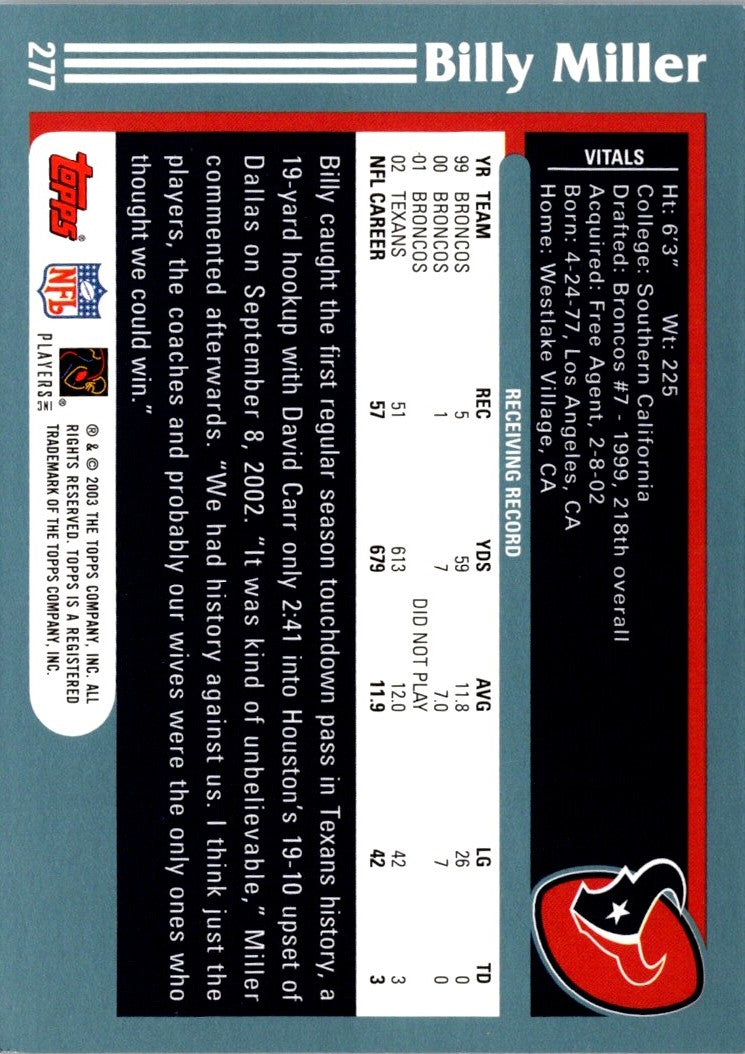 2003 Topps Billy Miller #277Houston Texans is a must-have for any football fan! This card features a full-color action shot of Miller in his iconic Texans jersey. The card also includes Miller's full stats for the 2003 season, including rushing yards, touchdowns, and receptions. This card is a great addition to any collection and is sure to become a collector's item. Get your hands on this card today and add a piece of Texans history to your collection!