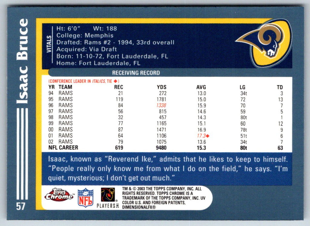 This 2003 Topps Chrome Isaac Bruce #57 St. Louis Rams card is the perfect addition to any NFL fan's collection! Show your support for one of the most talented wide receivers in the history of the game with this beautifully designed card. Featuring a glossy chrome finish and a full-color action shot of Bruce making a catch, it's sure to make a great conversation piece. Add this classic card to your collection today and show your love for the St. Louis Rams!