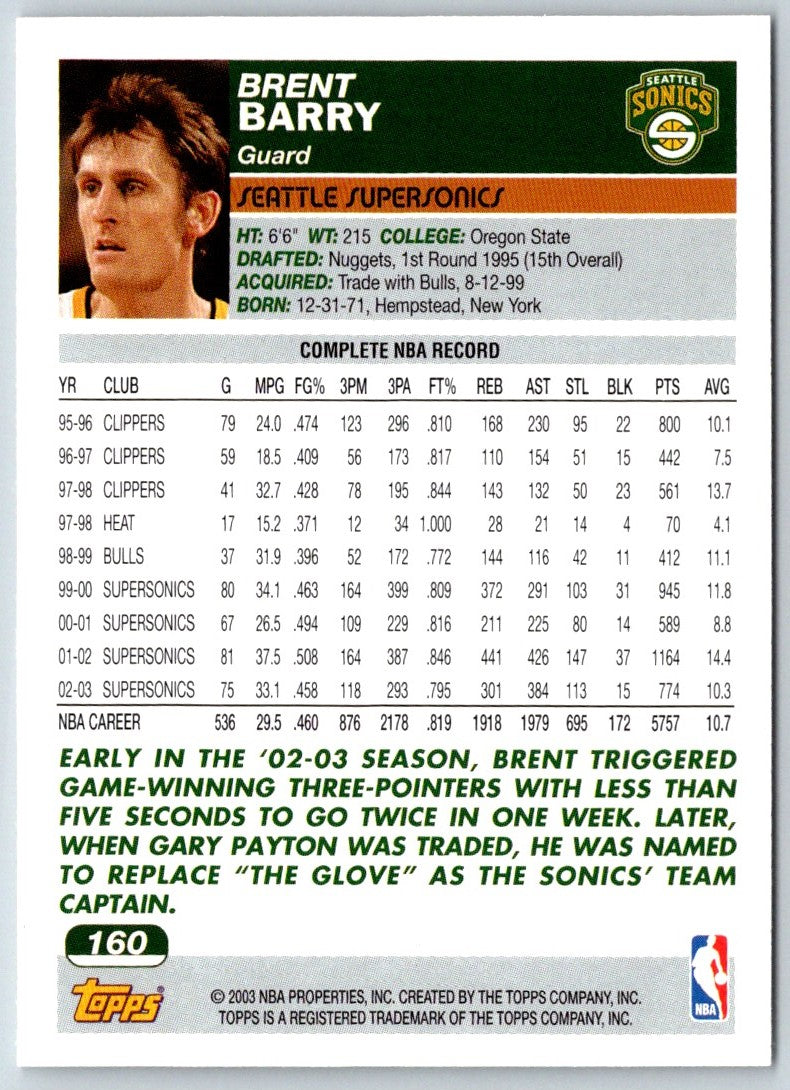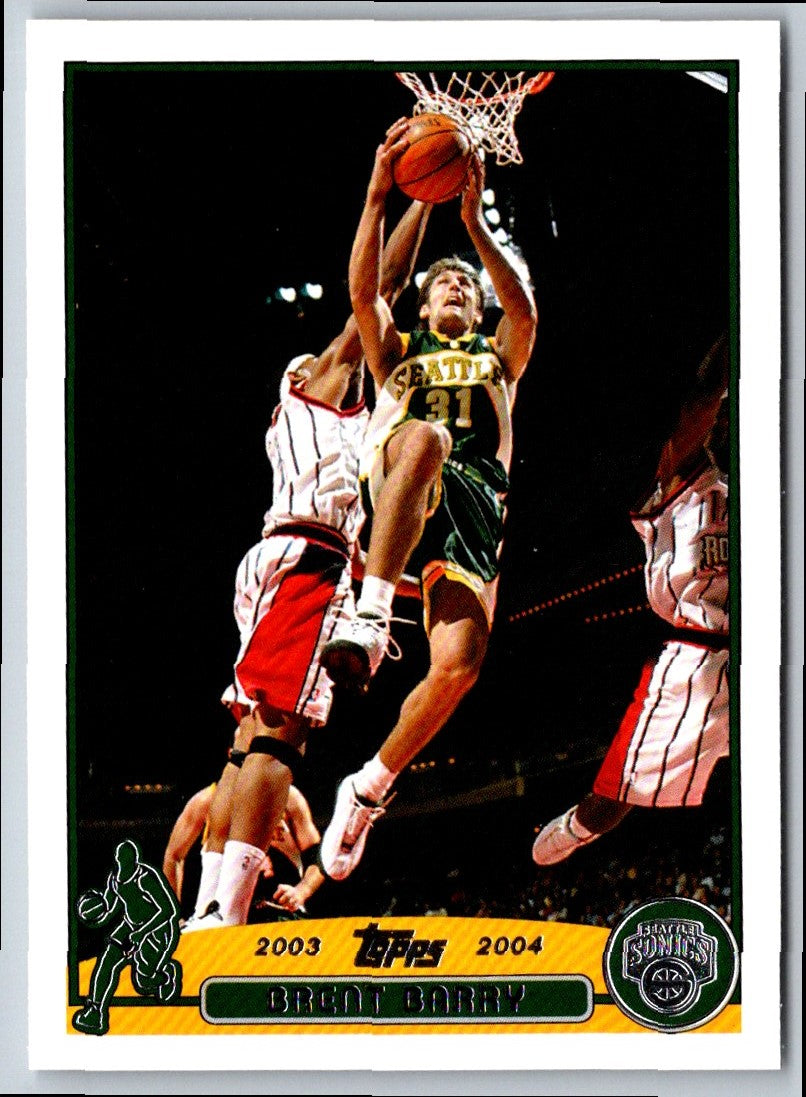 This 2003 Topps Collection Brent Barry #160 Seattle SuperSonics card commemorates the long-time NBA player's career. It features an action shot of Barry in his Seattle SuperSonics jersey and is sure to be a great addition to any basketball card collection. This card is in near-mint condition and is a great way to commemorate one of the NBA's greatest players. Add this card to your collection and show your support for Barry and the SuperSonics!